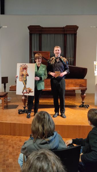 Elisabeth Föll hatte gerade die Veranstaltung am Klavier mit der Ouvertüre eröffnet und damit begonnen, die Handlung des Singspiels zu erzählen, als ein singender Mann mit Schlange um den Hals auf die Bühne stürmte und sie mit der Arie des Prinzen Tamino „Zu Hilfe! Zu Hilfe! Sonst bin ich verloren!“ unterbrach. Von den Schülern gab es zu Recht Szenenapplaus für den Gesangsstudenten Peter Ermer, der in Folge gemeinsam mit Frau Föll die Geschichte der Oper erzählte, und immer wieder Arien anstimmte und die Schüler zum Mitsingen, Mitklatschen und sogar zum Mitpfeifen animierte.